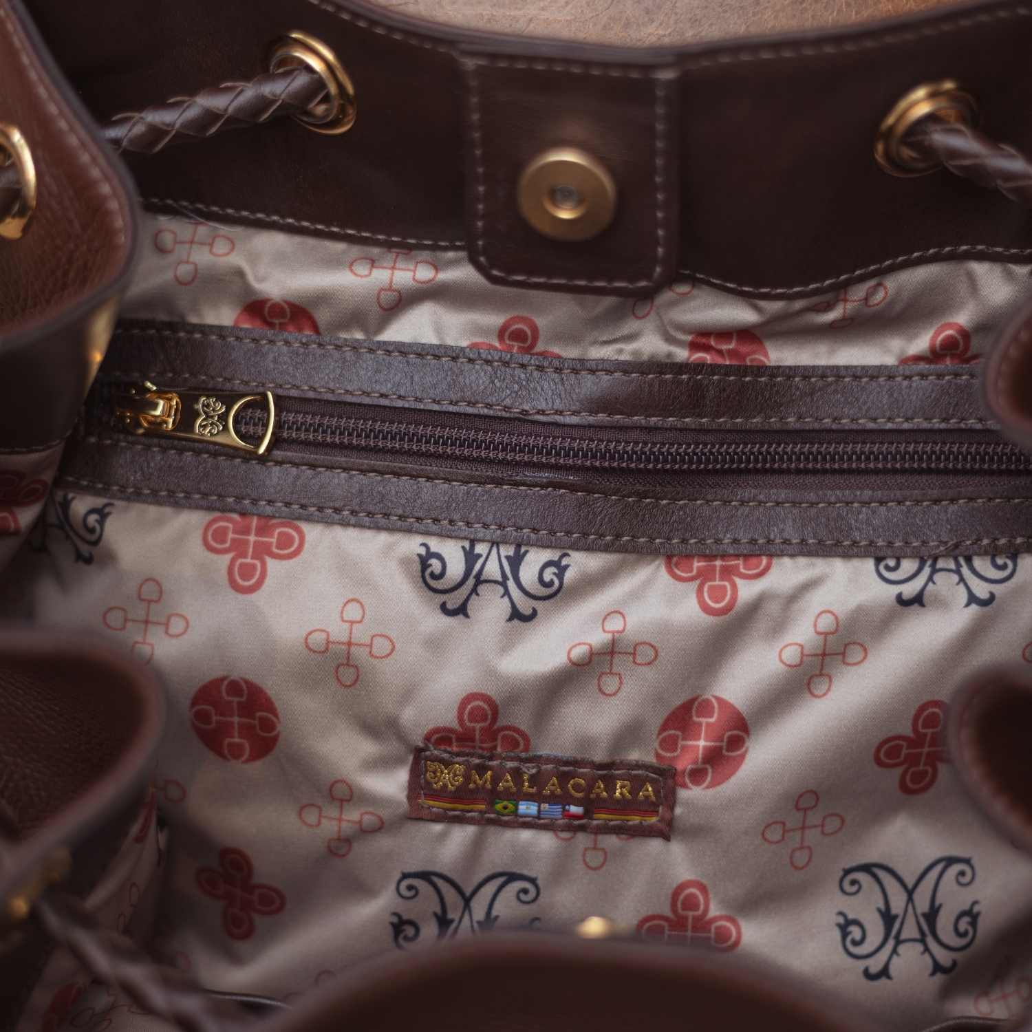 Os metais dourados adicionam um toque refinado, enquanto o fechamento em cordão, com o auxílio de um ímã, proporciona segurança e funcionalidade no dia a dia. O grande destaque fica por conta do logo estampado Malacara na parte frontal, um detalhe elegante que reforça a identidade única da peça.