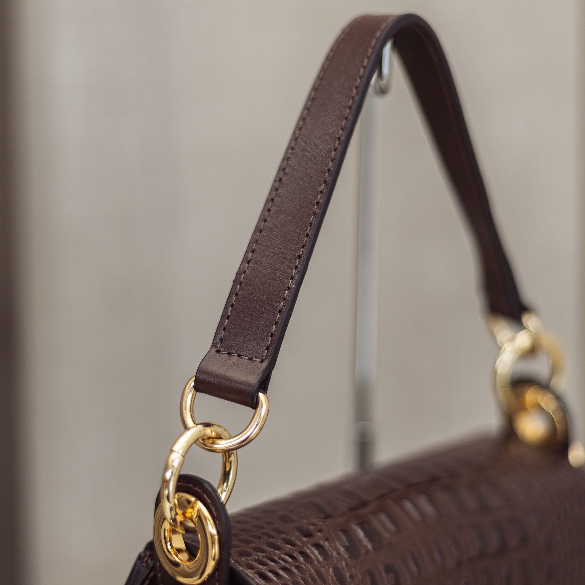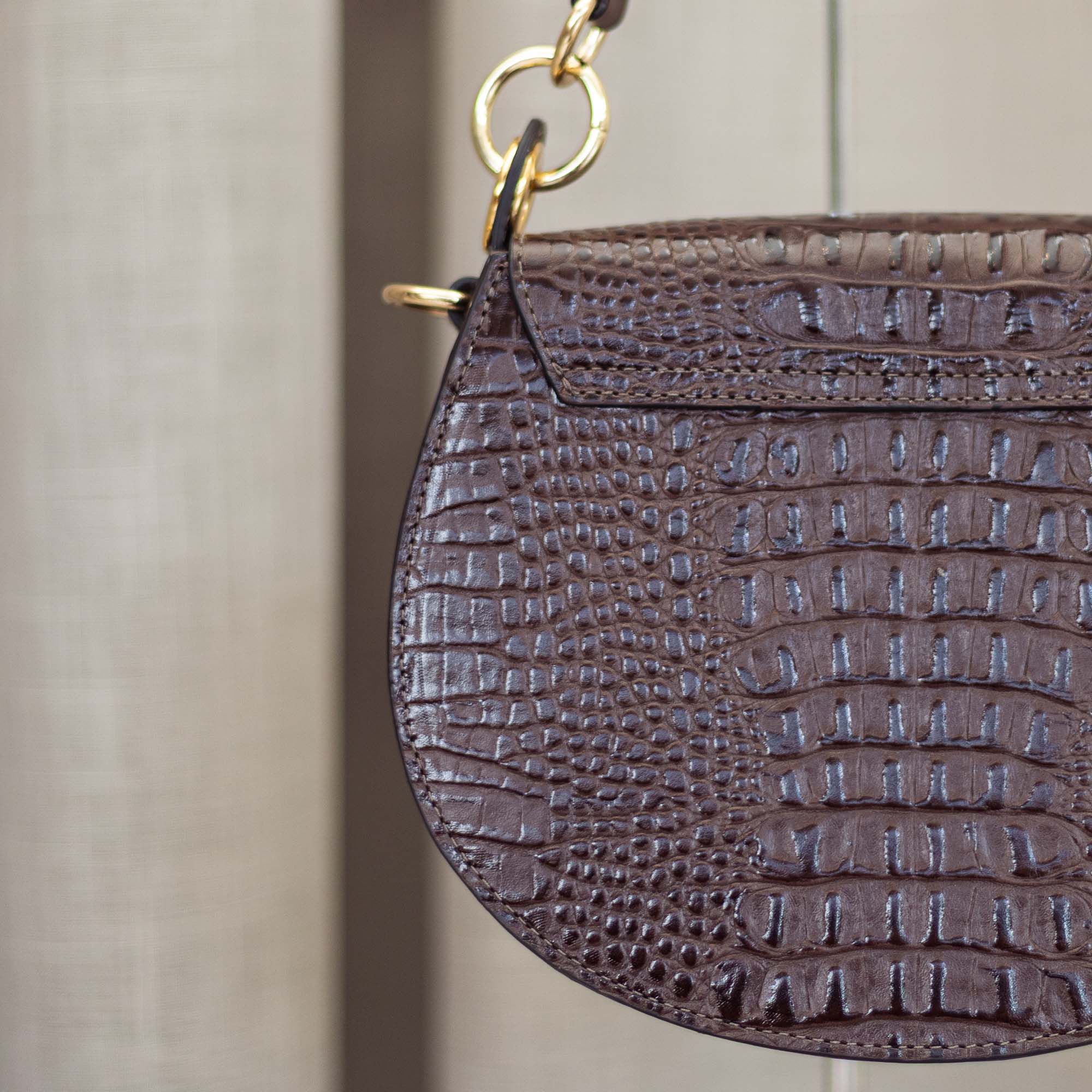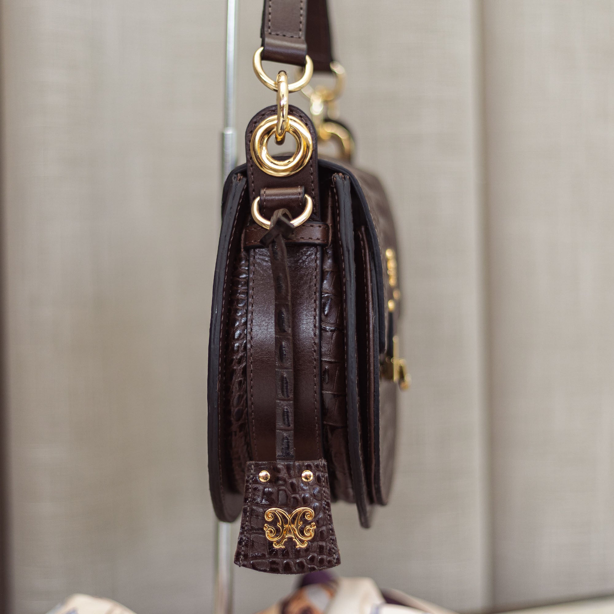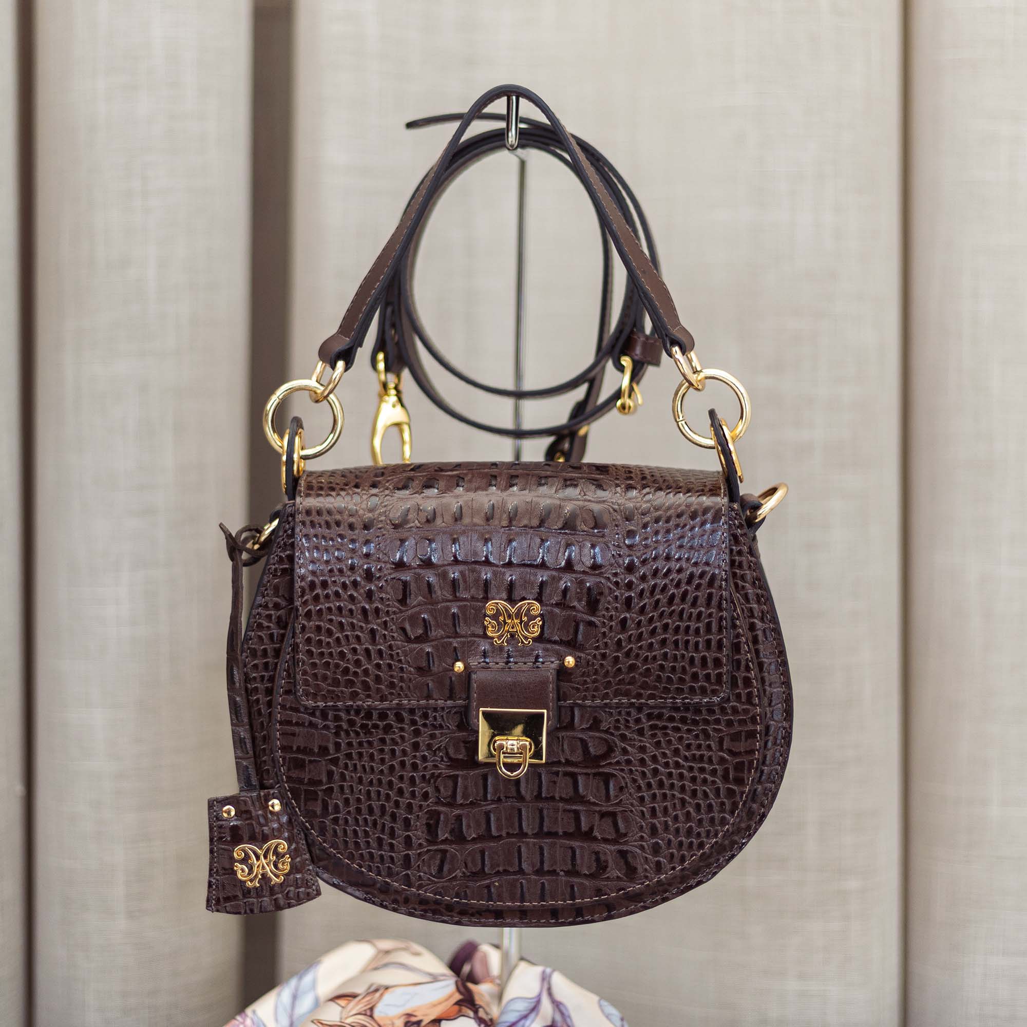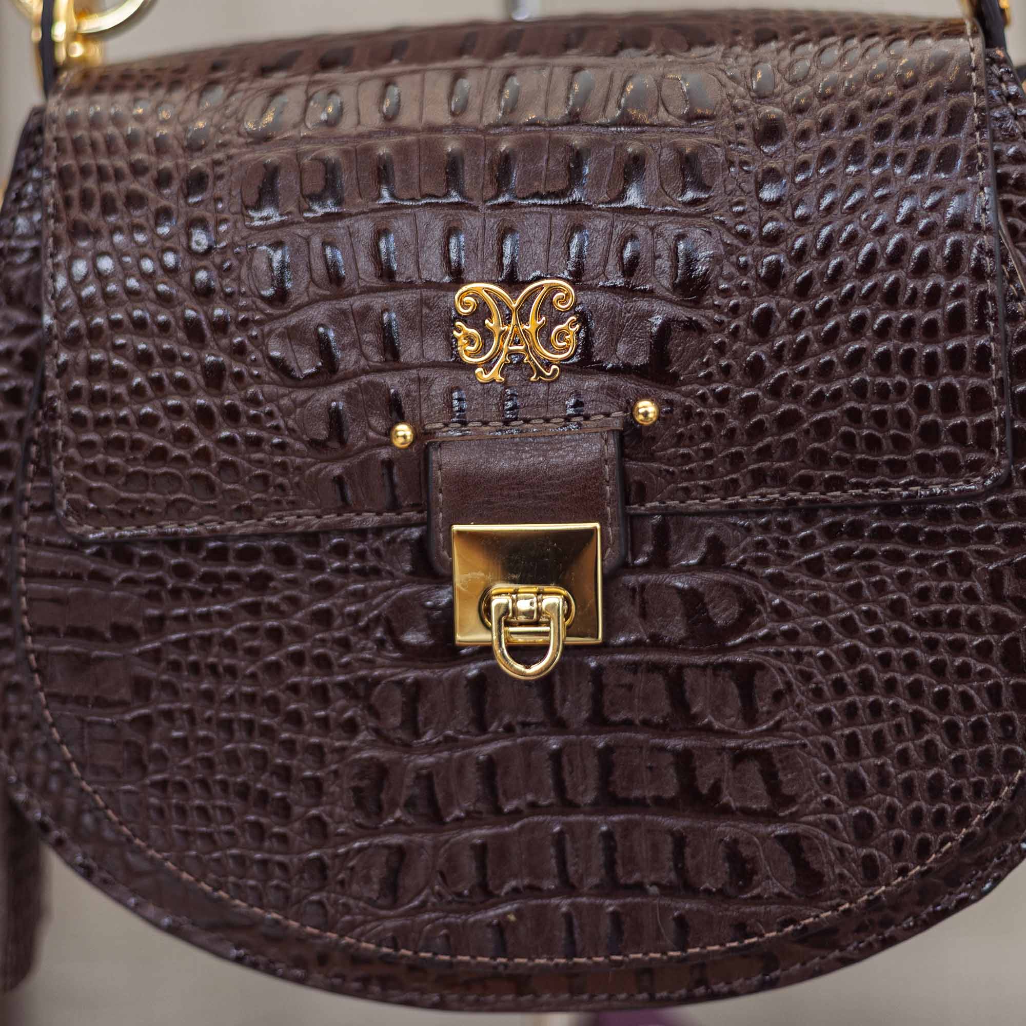 A Bolsa Payada da Malacara é a tradução da elegância rústica em um acessório de design atemporal. Com seu formato semicircular que remete às clássicas bolsas de sela, ela apresenta uma textura rica em couro com acabamento croco, trazendo uma profundidade visual única. O contraste entre o brilho sutil do couro e os metais dourados cria uma peça que transita com naturalidade entre o campo e os cenários urbanos mais sofisticados.