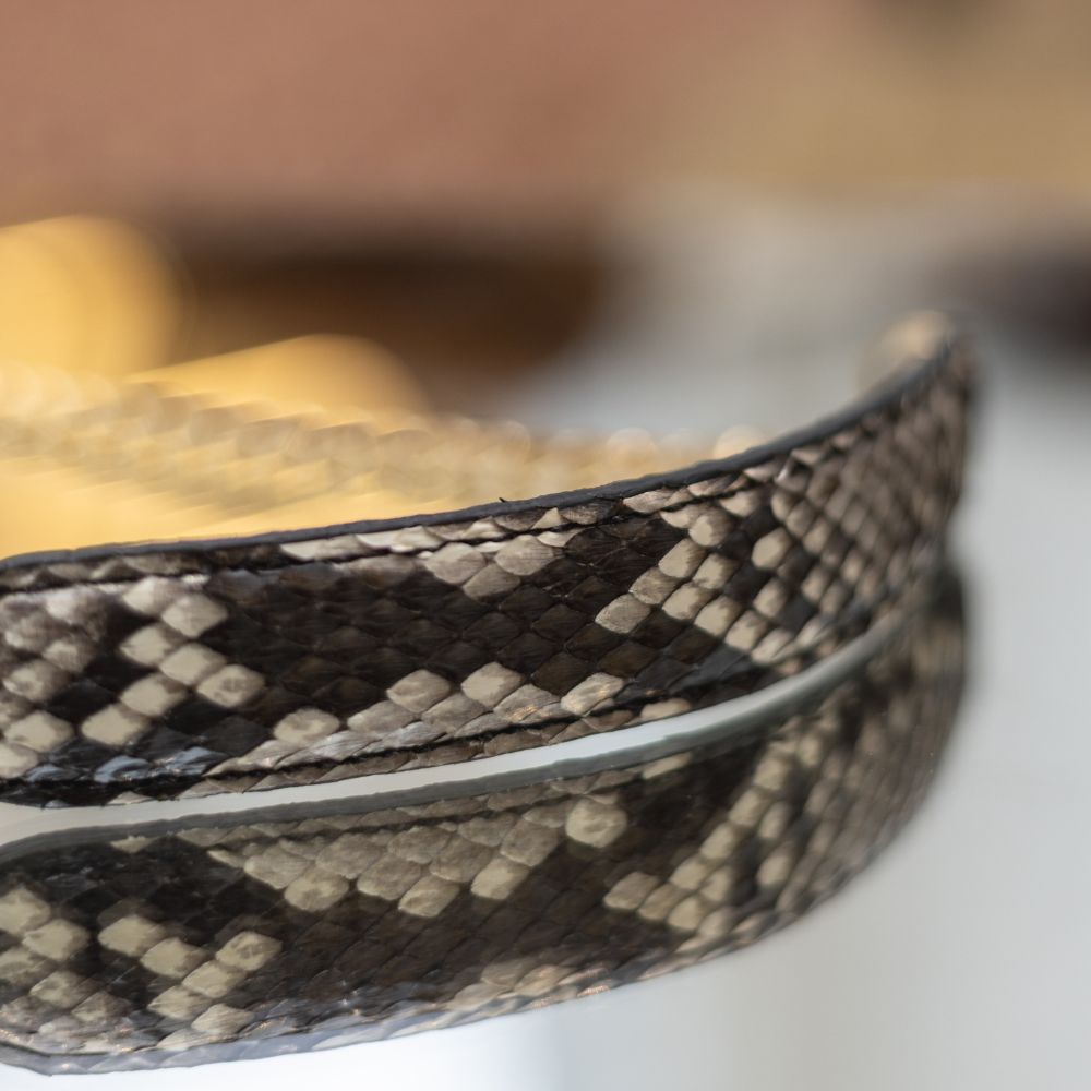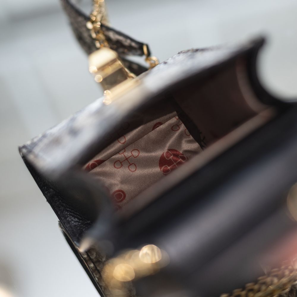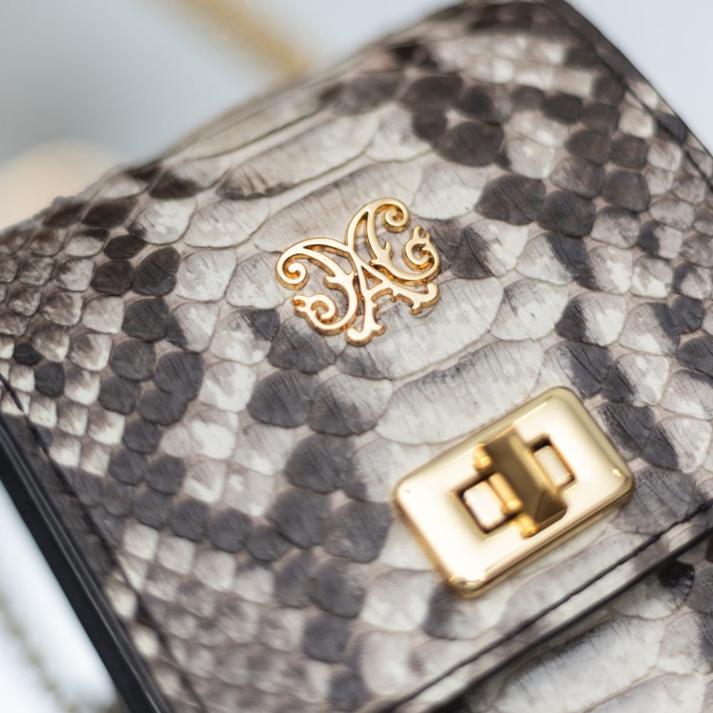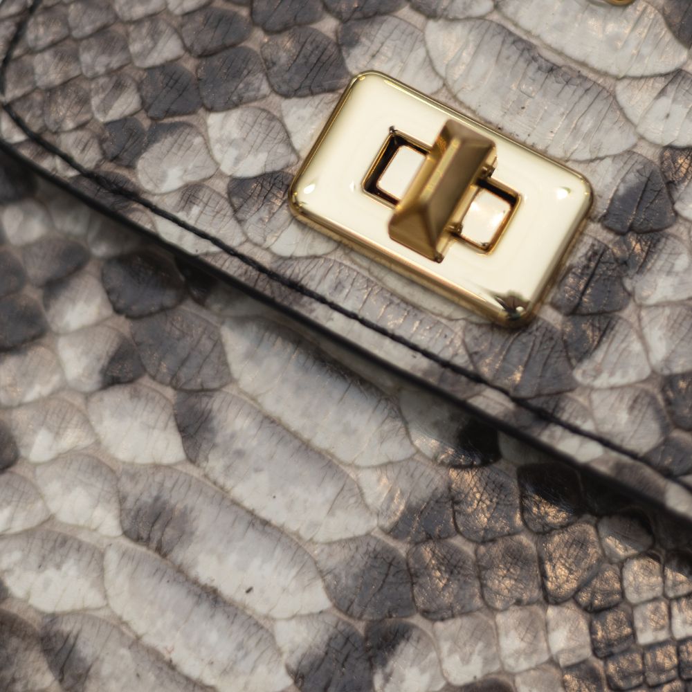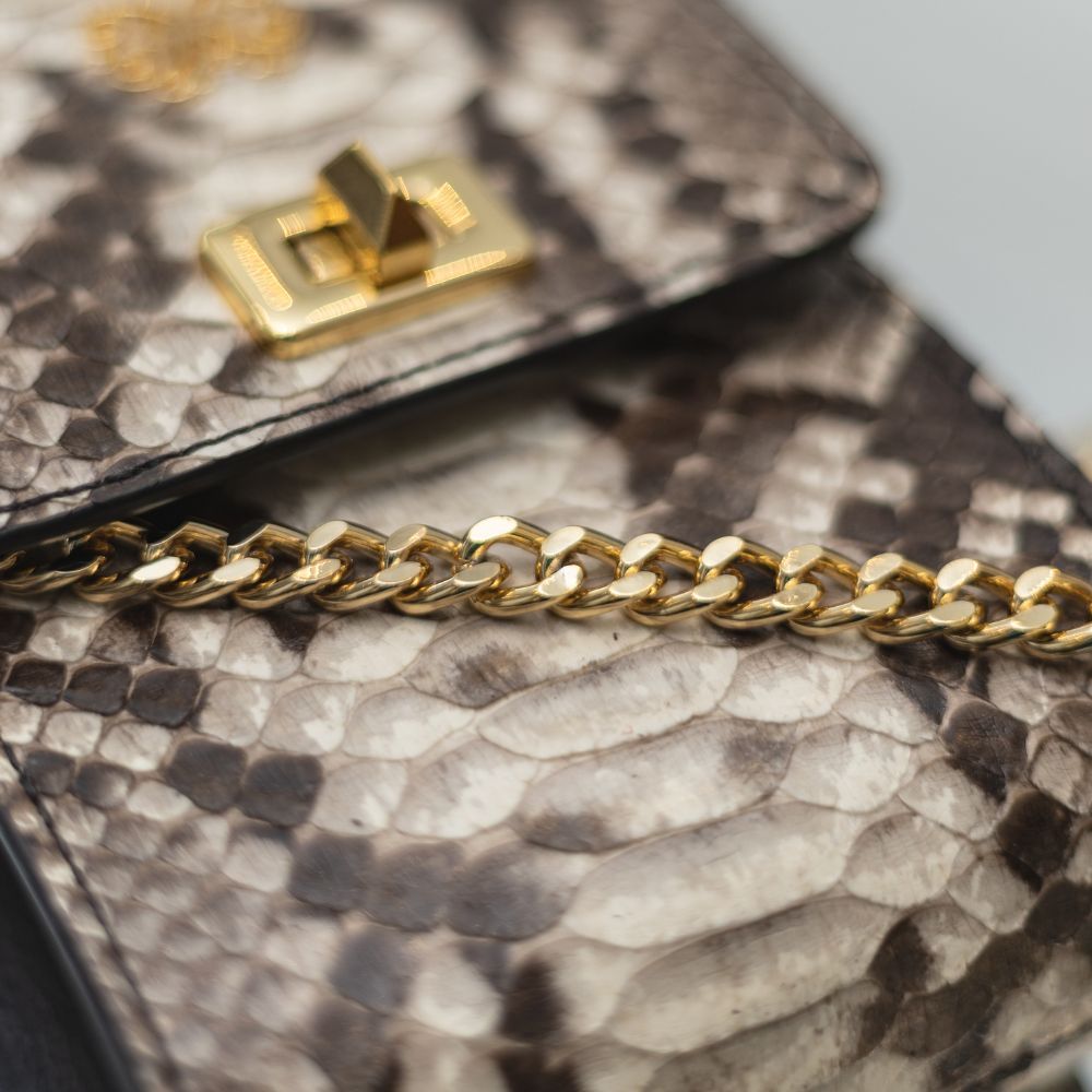 Confeccionada em couro Python, possui acabamento refinado, fecho metálico dourado frontal e alça longa em corrente com apoio de ombro em couro, permitindo uso transversal ou a tiracolo. Seu tamanho é ideal para levar o essencial, mantendo leveza e sofisticação.