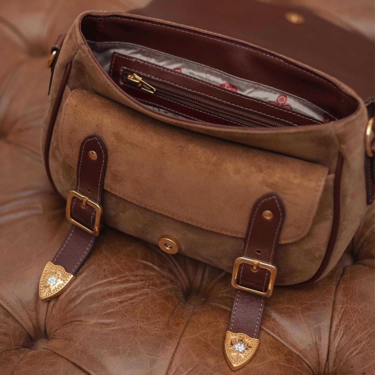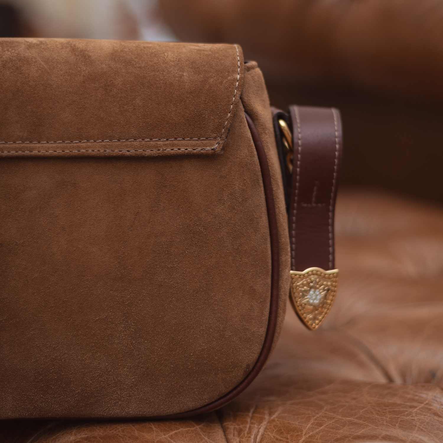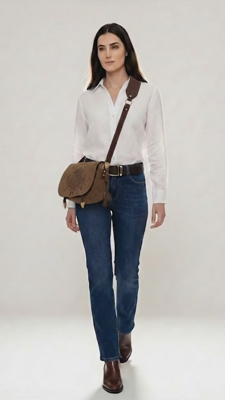 A Bolsa Rédea Solta em Sued traduz a elegância despretensiosa da Malacara. Confeccionada em couro camurça de toque aveludado, ela revela uma estética sofisticada com espírito livre, marcada pelo brasão em baixo-relevo e pelos acabamentos em couro liso contrastante. O formato compacto com aba estruturada equilibra charme e funcionalidade, ideal para acompanhar a rotina com leveza e personalidade.