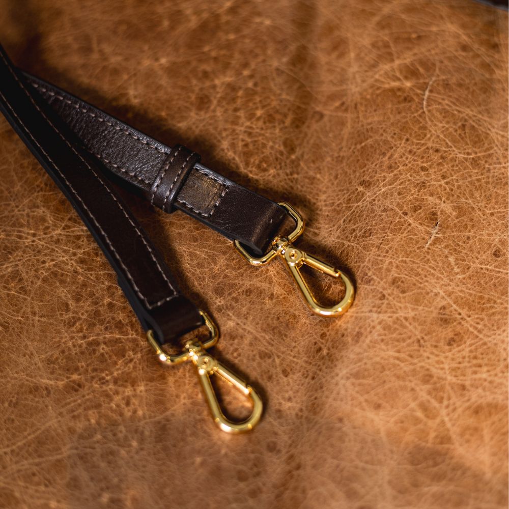 A Bolsa Rosário combina a essência rústica do couro nobre com a sofisticação dos detalhes dourados, resultando em uma peça que transita com naturalidade entre o clássico e o contemporâneo.