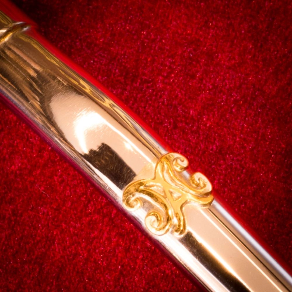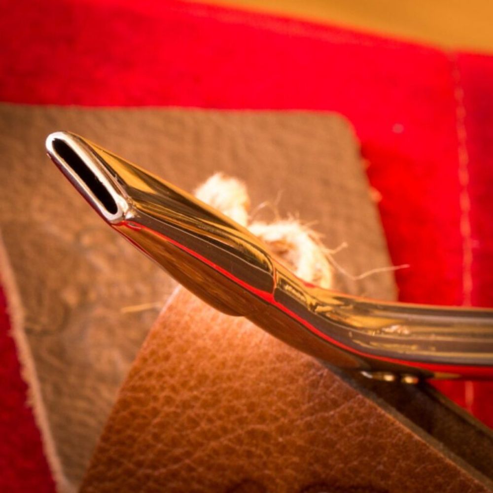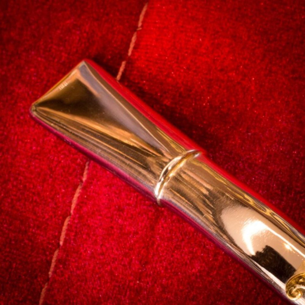 Com o comprimento de 24cm e fabricada em aço inox, a peça carrega a assinatura da marca como destaque em alto relevo em fio de ouro.
