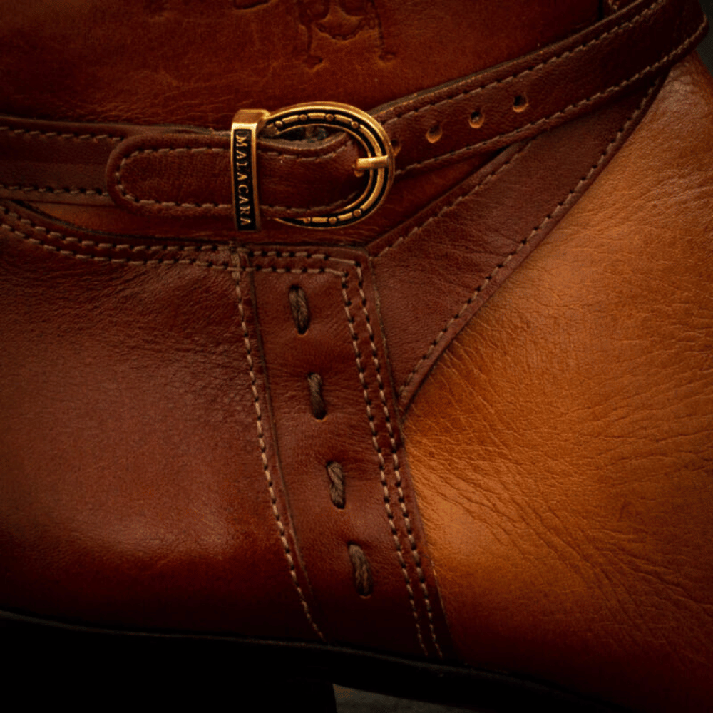 A Compay Sesmaria foi desenhada para exaltar a preciosidade do trabalho manual e, através das costuras laterais, reforça a delicadeza desta arte. A peça foi concebida toda em couro liso, com detalhe em outro tom que envolve o calcanhar, e finaliza com a tira de couro presa ao início do cano. Salto compay e acabamento interno macio trazem o conforto necessário à peça. A assinatura Malacara está presente no carimbo, que ganha lugar de destaque ao ser fixado no cano.