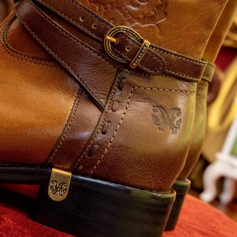 A Bota Salamanca une simplicidade e conforto, inspirada na bota montaria tradicional. Feita em couro de alta qualidade, com solado Malacara e cano curto, oferece praticidade e estilo. O diferencial fica nas duas cores de couro, nas costuras manuais que destacam o cuidado artesanal, e no detalhe metálico no salto, combinado ao carimbo no cano, que conferem sofisticação e elegância ao visual.