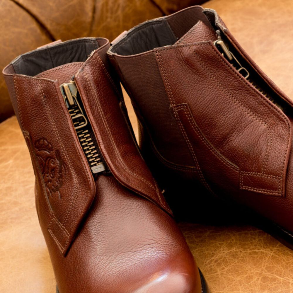 Toda fabricada em couro e com dois elásticos na lateral, é o zíper frontal que remete às peças específicas para o esporte, porém com todo o conforto necessário para usar no dia a dia.