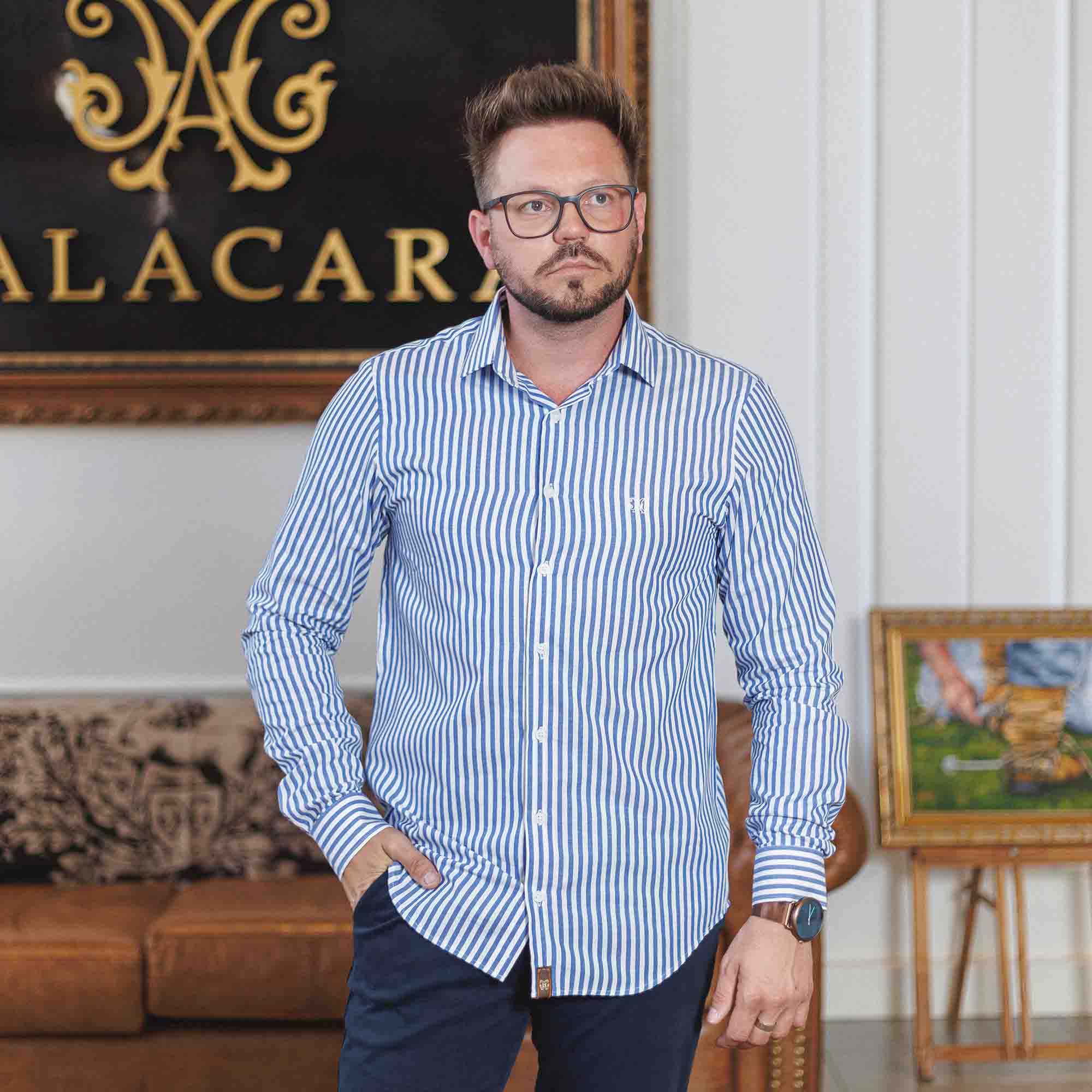 Complemente seu visual com calças de alfaiataria ou sarja e esteja pronto para se destacar com a Camisa Malacara Estribo Listras.