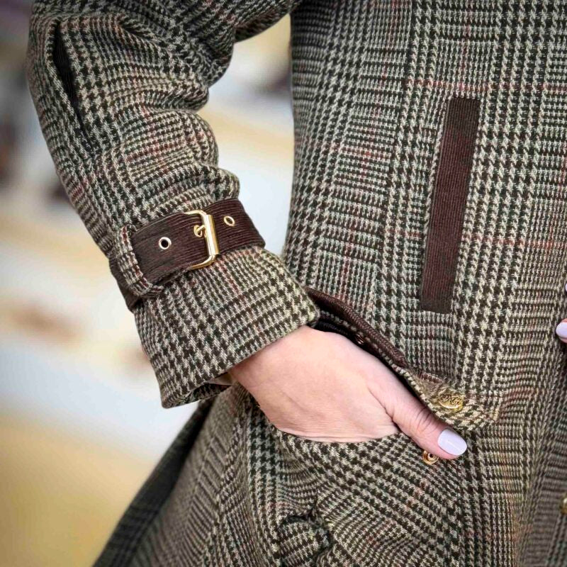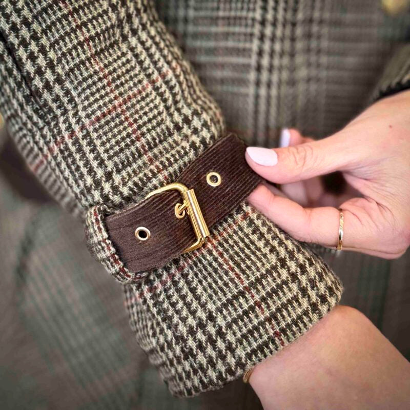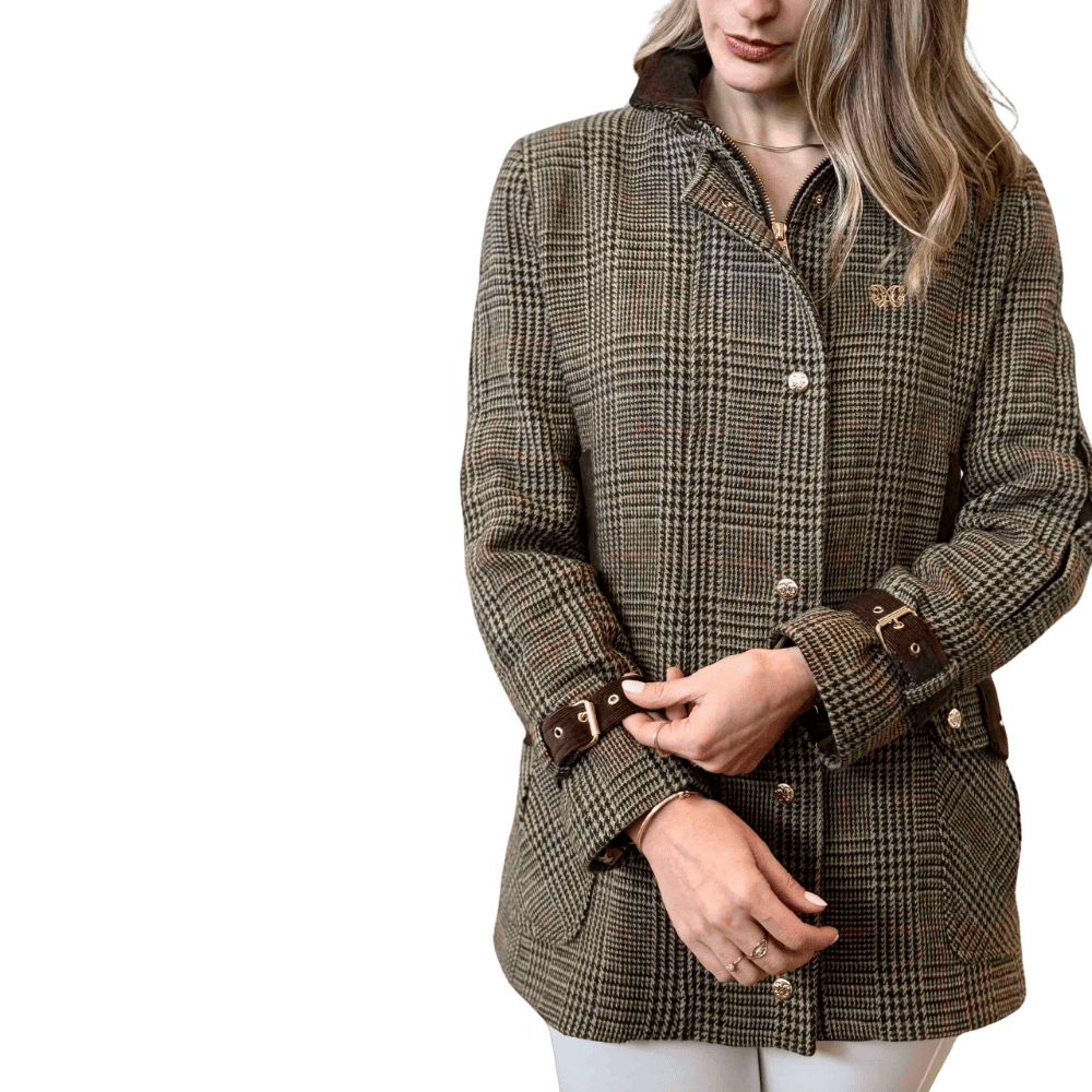 Ele possui um fechamento frontal em zíper que garante praticidade e um ajuste seguro. Os punhos são detalhados com elegantes fivelas, proporcionando um toque moderno e personalizado, além de ajudar a manter o calor.
