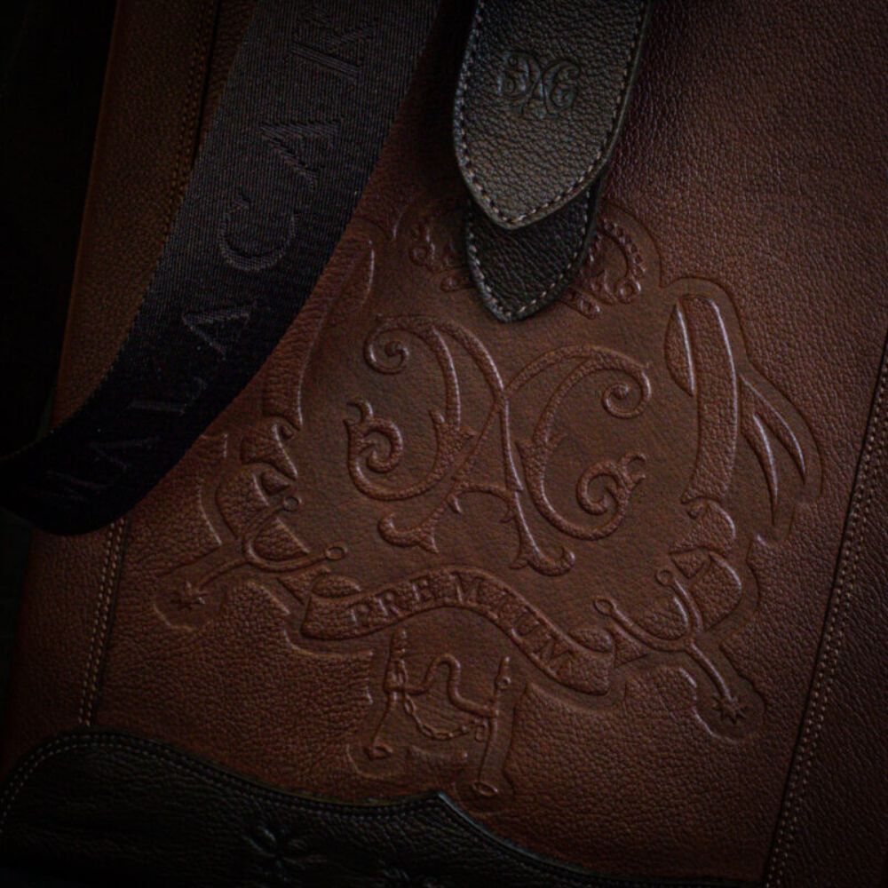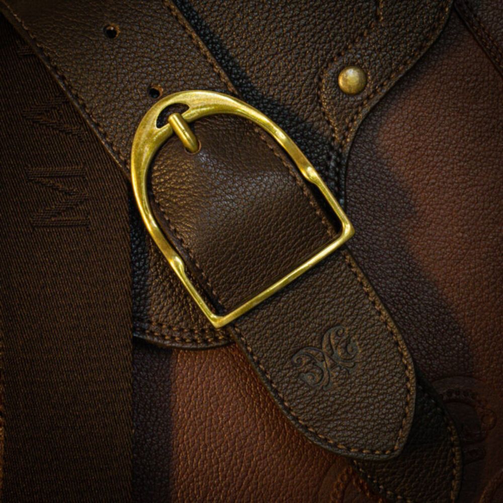 O fechamento é feito por uma tampa com imã, garantindo segurança e praticidade, enquanto a fivela personalizada em forma de estribo adiciona um charme exclusivo à mateira. O metal frontal com o logo da Malacara reforça a identidade da marca de maneira sutil, com metais em ouro velho que elevam ainda mais o design da peça.