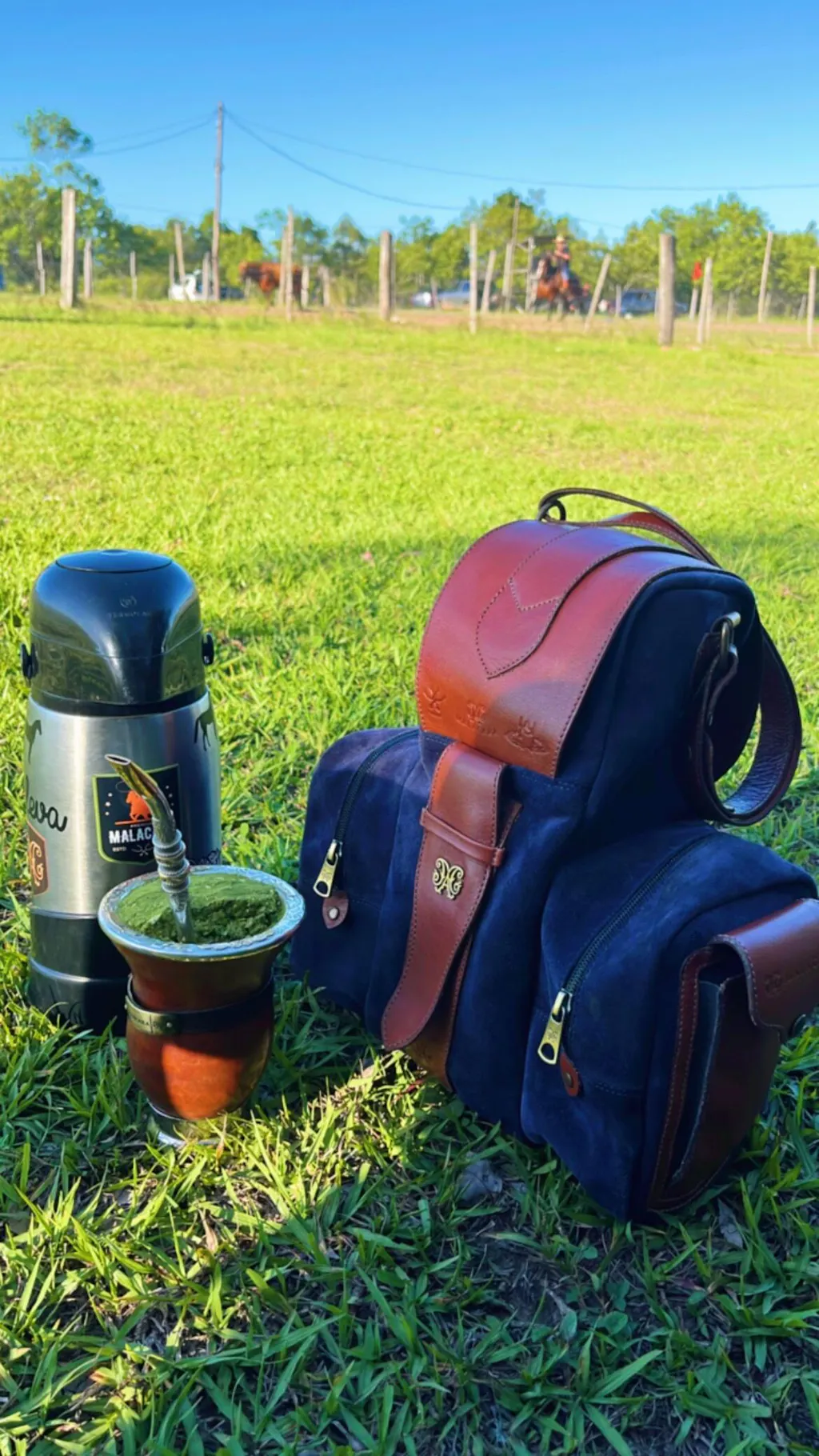 Feita em couro bovino e camurça, a peça acomoda seus itens para chimarrão em compartimentos independentes: o espaço para térmica está maior que o tradicional, com capacidade inclusive para as térmicas de pressão.